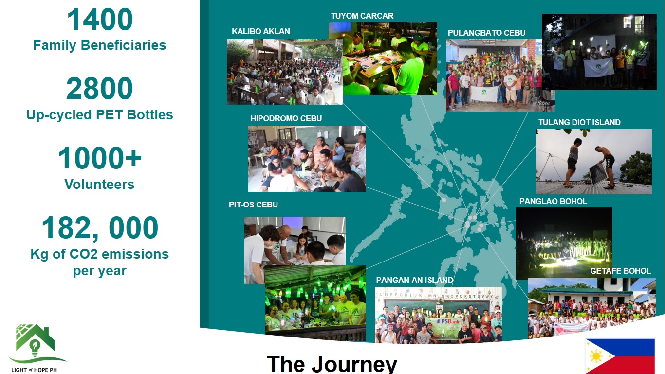 Light of Hope PH started a project in 2017 that upcycles the PET plastic bottles into a solar night lamps and utilize solar energy to power the LED light. Spreading awareness on climate change the team does workshops in schools, universities, companies and communities, engaging many volunteers specially the youth.